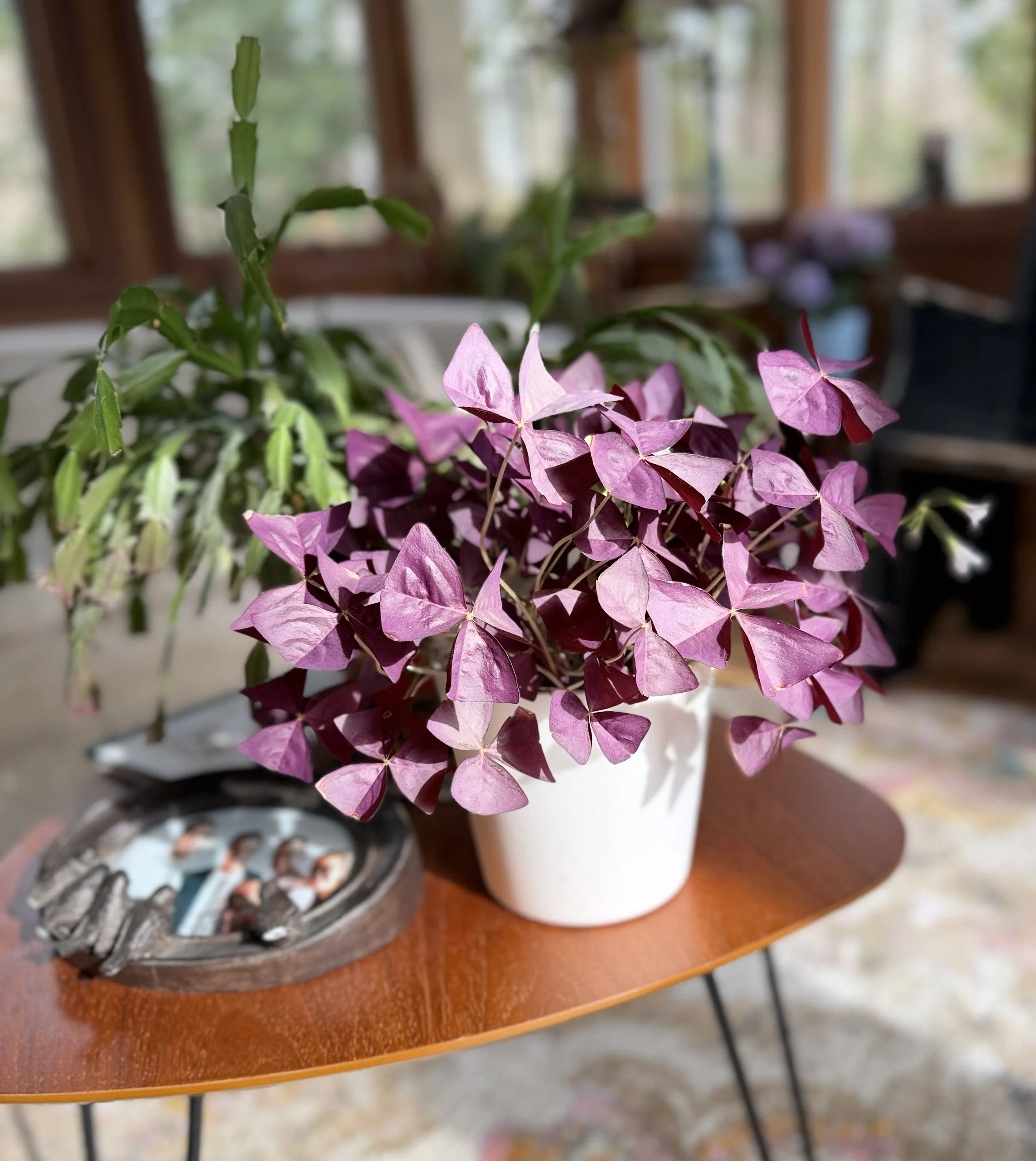 Two fun facts. Its leaves are photophilic; which means at night they fold up, and during the day these cute little purple “butterflies” open up to receive as much light as possible.